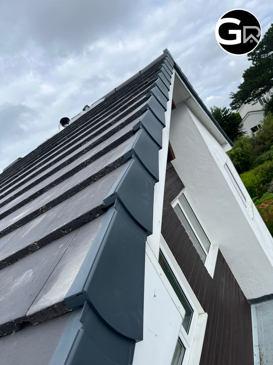 Series of images showing before and after shots of a roof replacement. New vapour permeable sarking membrane and treated timber battens installed. Then composite concrete flat tiles. New mechanically fixed ridge tile system as per UK Building Regulations and mechanically fixed interlocking uPVC verge caps.