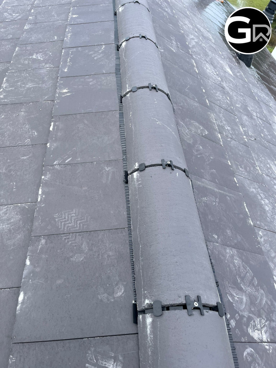 Ridge tiles and verge caps are essential to roof stability. In a storm wind creates direct presure on a roof but also suction force as the wind blows over the roof and uplift when the house walls deflect the air currents in different directions.